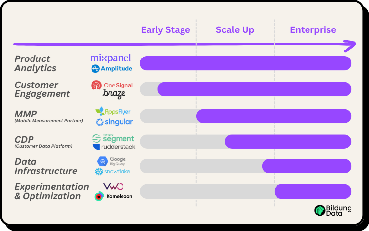 Y en Enterprise, apuesta por CDPs, Data Warehouses y herramientas de experimentación para operar a gran escala y optimizar continuamente.