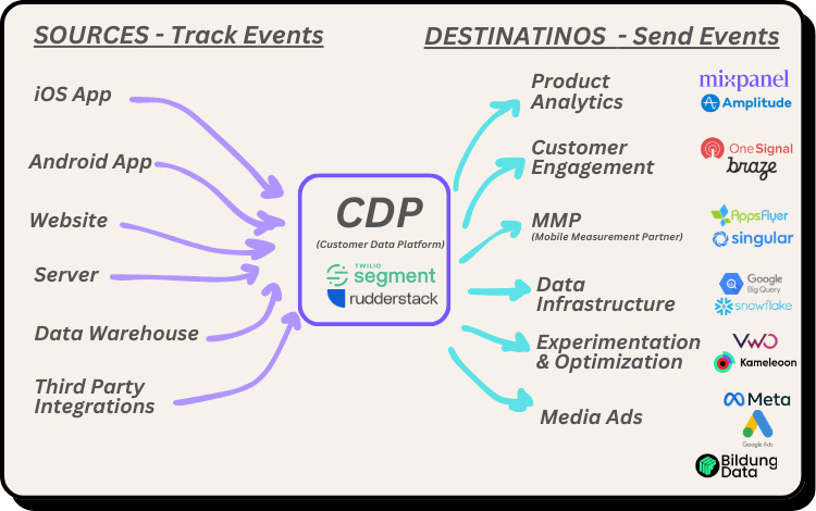 Con un CDP, como Segment o Rudderstack, se soluciona porque importa todos los eventos en una única fuente y desde allí puedes agregar destinos donde decides qué eventos enviar - por ejemplo tu plataforma de Product Analytics, CEP, MMP, Meta Ads, Google Ads...